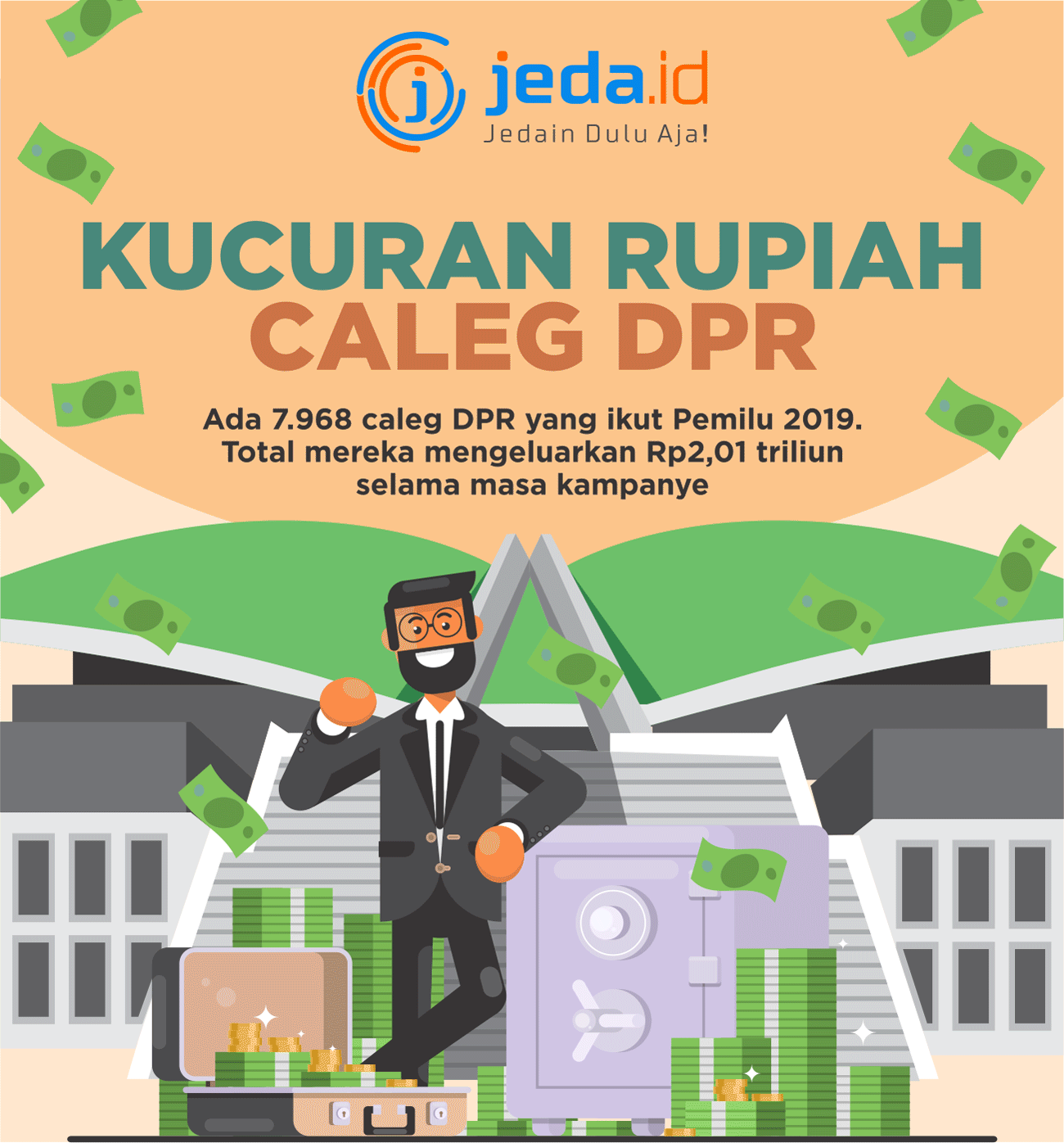 JEDA.ID–ribuan caleg DPR menghabiskan Rp2,01 triliun selama masa kampanye. Besaran dana kampanye calon wakil rakyat di DPR itu mencapai 85.9% dari total dana kampanye partai politik (parpol) Rp2,34 triliun. Bila di rata-rata, tiap caleg DPR menghabiskan Rp252,98 juta untuk kampanye. Dalam Pemilu 2019 terdapat 7.968 caleg DPR dari 16 parpol.