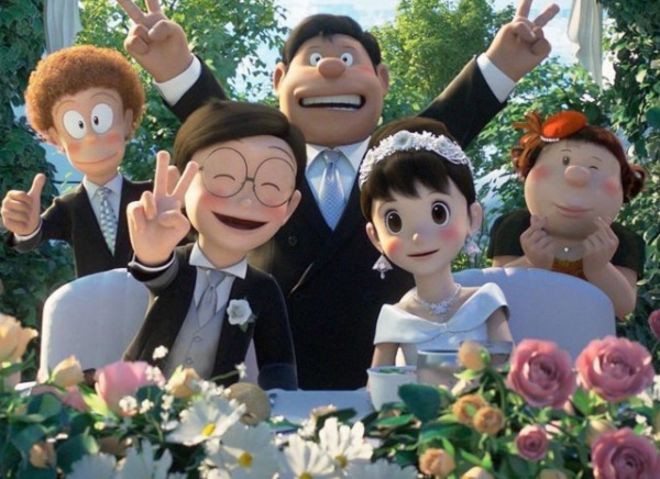 Di dalam poster film tersebut, Doraemon terlihat terharu dan menahan tangis saat melihat Nobita menikah.