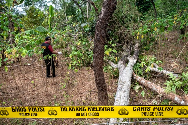 Personel Tim Labfor Mabes Polri Cabang Semarang melakukan olah tempat kejadian perkara (TKP) peristiwa ledakan yang diduga akibat loncatan arus jaringan transmisi Saluran Udara Tegangan Ekstra Tinggi (SUTET) 500 kV interkoneksi Jawa-Bali yang melintang di Gunungpati, Semarang, Jawa Tengah, Selasa (6/4/2019). Gangguan di area SUTET tersebut pada Minggu (4/8/2019) lalu diduga menyebabkan blackout di wilayah Jabodetabek, sebagian Jawa Barat dan Jawa Tengah. (Antara)